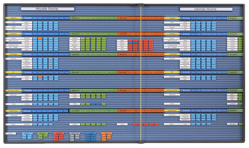 Der Dynasicht Schichtenplaner von WEIGANG basiert auf dem bewährten Dynasicht-Plantafelsystem und überzeugt durch Flexibilität und klare Struktur. Jede Tafel besteht aus modularen Elementen, die in einem stabilen Rahmen eingefasst sind.